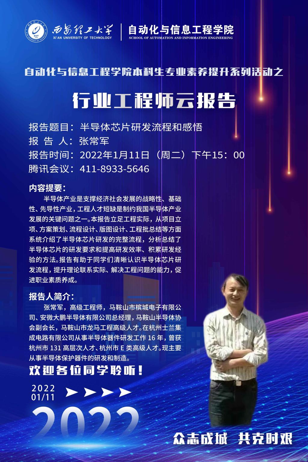 在“行业工程师云报告”活动中,陕西省半导体行业协会产业研究部部长李明志为师生带来了题为我国半导体产业概况与发展形势的报告,他在介绍半导体产业链的基础上,针对当前的产业发展形势,对国内外半导体产业发展现状、特点和趋势进行分析,并以我省半导体产业为例,对行业的政策、科研、人才、投资、平台等方面进行探讨;行业专家张常军以半导体器件研发与感悟为主题,立足工程实际,从项目立项、方案策划、流程设计、版图设计、工程批总结等方面系统介绍了半导体芯片研发的完整流程,分析总结了半导体芯片的研发要求和提高研发效率、积累研发经验的方法。